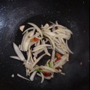 葱段,蒜,花椒,干辣椒炒香,然后放入洋葱继续炒香