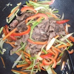 牛肉含水,所以会出很多水大火翻炒到收汁。(不过个人喜欢带点汤汁的,所以炒到酱油进入牛肉后,可以先把干的部分盛起来,剩下的汁加点辣椒粉和胡椒继续收浓。然后浇在盛起的菜上!)