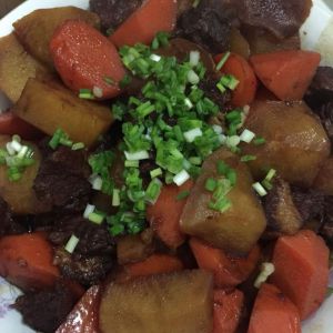 高压锅炖好,倒入煤气灶锅继续炖到肉烂,加入胡萝卜土豆盐炖至汤稠盛入碗中撒上葱花即可