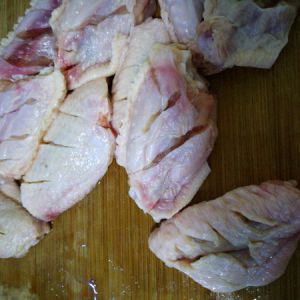 酱油两勺,料酒一小勺,烧烤料,姜丝和鸡翅搅拌腌制二十分钟左右。