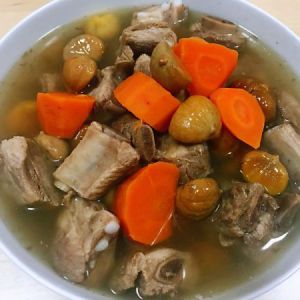 锅里烧开水放入排骨煮两分钟去浮沫,再将排骨放入电饭煲,一小时后放入板栗和胡萝卜,再过一小时开吃。