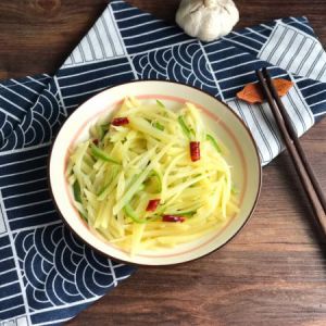 将土豆去皮,清洗干净。先切成薄片再切成细丝。放入水中,过几遍水,这样可以除去土豆中的淀粉,吃起来更加爽脆。喜欢面一点的口感过一遍水就可以了哦。