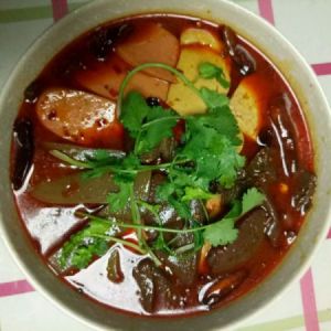 锅里的底汤烧开依次放入魔芋,豆腐,鸭血火腿和毛肚,(毛肚一定最后放,不然煮的时间长口感老了)煮熟即可。