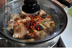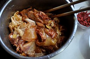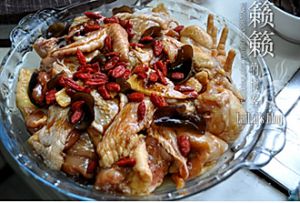 将腌制好的鸡块平铺在黑木耳上,撒上枸杞子