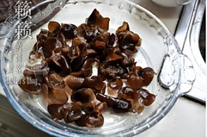 黑木耳泡发洗净,摘除蒂头(特别脏的地方可以用少许食盐搓洗,去污杀菌),控干水分后铺入蒸盘中;枸杞子清水稍加淘洗后控水备用;