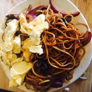 然后加入蒜末爆香,在顺次放入洋葱,米粉,木耳,烤麸翻炒至熟。