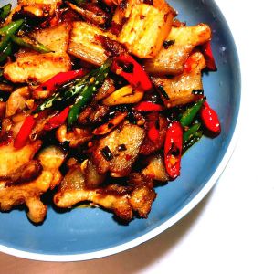 盛出青红辣椒,然后放油,待油锅热后下五花肉,待肉有焦色后放入料酒去腥,加盐少许,加生抽。