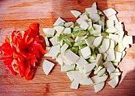 西葫芦切片,红椒切块,培根切断儿,小香葱切碎断儿。