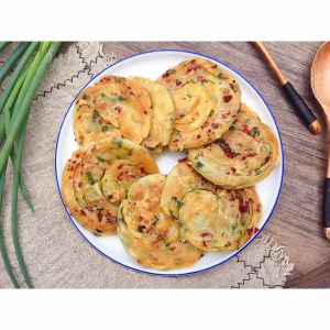 平底锅温热,倒入少许油,温锅冷油,放入葱油饼,中小火煎至两面金黄