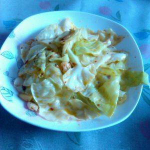 锅中入油油热加入蒜瓣辣椒碎,炒香倒入包菜,翻炒几下加入盐和十三香,翻炒均匀,锅干的沿锅边加些清水,待包菜变软沿锅边淋入少许生抽和多一点的醋,加入一丢丢白糖,翻炒均匀出锅即可。