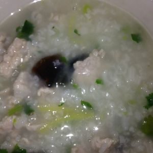 放适量的米在锅里煮,煮到和白粥的份量差不多就放入切好的瘦肉,姜丝