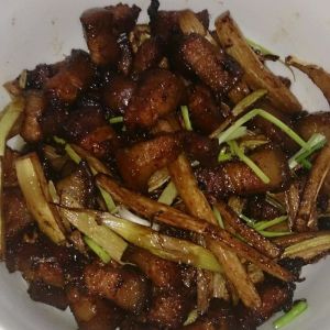 葱白,花椒,八角等炸香,放入肉炸。炸至金黄时放少量水煮,一定要煮不然肉不熟的^_^