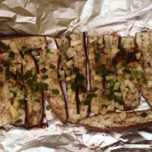渗水后的茄子放锡纸中间,表面撒葱姜蒜末,撒黑胡椒粉和椒盐,然后把锡纸折叠盖住茄子。同时烤箱170度预热五分钟,进烤箱约15分钟左右。成功。