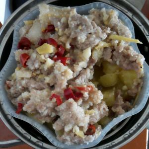然后就把肉里面加入重庆米粉,用手揉均匀,把土豆放进容器里面,上面铺好肉,放进锅里蒸就是啦,等25分钟的样子,就可以了,可以剥开肉,插里面的土豆,如果软了,就可以吃了。