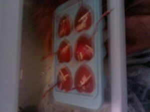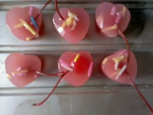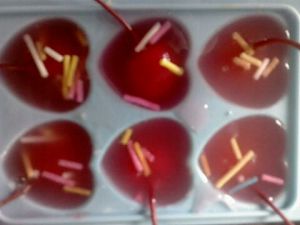 将熬好的果汁倒进桃心模具中,再洒点彩针装饰喔