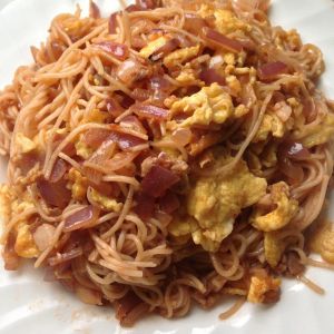 把面放进去翻炒,要加一点水喔,这样面会QQ的!