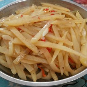 下油,土豆,野山椒一起炒,适当的时候加点水,快出锅的时候放入大蒜,醋,盐,生抽既可