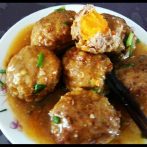 抓捏肉丸子塞入一个咸蛋黄搓圆待用,锅里倒入适量的油,烧至七成热放入丸子炸至定型,关小火,待外表金黄捞出。