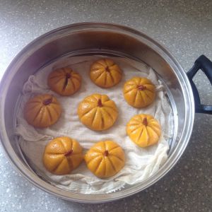 将老南瓜适量隔水蒸熟透,去皮,捣成南瓜泥