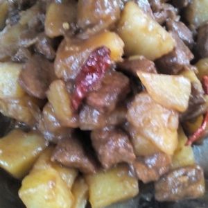 油烧热放辣椒段,花椒,蒜末爆香入肉肉超白加红烧酱油炒致上色下土豆炒两分钟加高汤或清水顿30分钟。