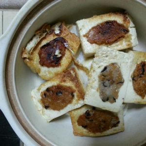 豆腐切块,中间用调羹挖个小洞,将馅料填入。