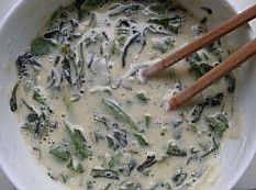 在放一些面粉和一些水,把他们搅拌成糊状,稠稀适中