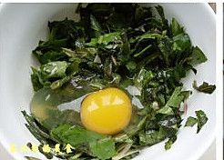 往苦菜里打入一个鸡蛋,放少许盐,把鸡蛋打开