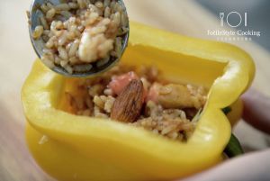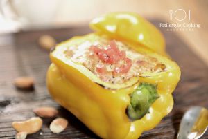 将拌好的米饭盛入彩椒里,装平即可,不用压紧。