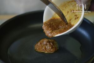 咖喱酱用温水泡开,中火烧热锅中油,倒入咖喱酱