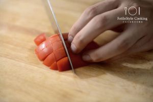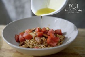 将米饭、西红柿、杏干、腰果混合,调入白醋和橄榄油拌均匀备用