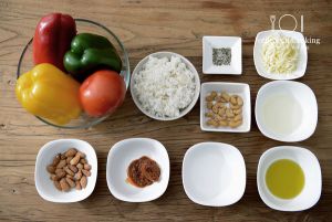 米饭1碗,彩椒4个,马苏里拉芝士100克,西红柿1个,腰果15克,杏干10克,咖喱酱10克,黑胡椒2克,橄榄油5ml,白醋3克,油5ml