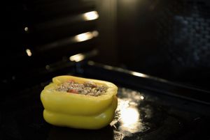 烤盘底刷油,把装好米饭的彩椒码入烤盘里,190度烤二十分钟。