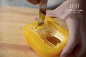 彩椒洗净,从中间切开,去籽去筋,用沸水烫一下内部以消毒