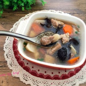 用筷子戳入排骨中感觉炖烂就将山药、胡萝卜和黑木耳放入锅内开大火烧15分钟;