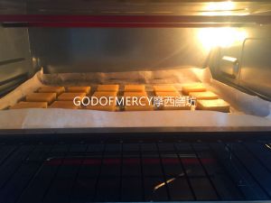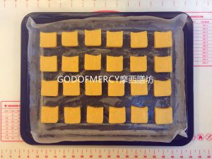 切好后横切面向上放入铺有油纸的烤盘里,每片之间留出足够空隙。