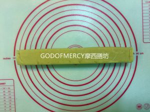 面团整形成长条用保鲜膜把包起来,放入冰箱冷冻室1个小时左右,直到面团变硬取出,用刀切成厚1cm左右的的片状。