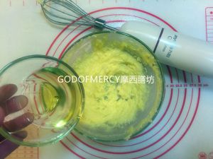 加入亚麻籽油用打蛋器搅打。打发到黄油体积蓬松,颜色变浅。用打蛋器继续打发,直到鸡蛋和黄油等完全融合成为蓬松细腻状态。