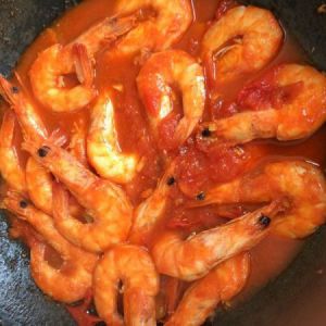 把虾放油里炒至发红,然后放入西红柿炒,然后放入一些热水炖一会,然后装盘