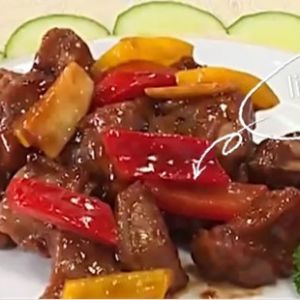 加料酒、生抽、香醋、冰糖翻炒一下再加入半碗水,大火烧煮5分钟后,加入切好的红椒黄椒(放入剩下的一半),最后加入山楂片改中火炒3-5分钟。