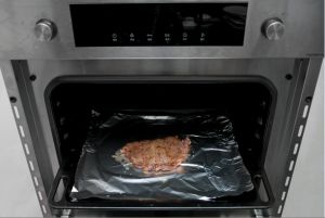 烘焙:烤箱预热完成的提示音出现后,快速将烤盘放入烤箱中层,关上烤箱门,在烤到烤箱所剩时间为2分钟时,按下暂停键,小心取出烤盘,将牛排翻面,重新将烤盘放回烤箱,再按暂停键,让烤箱继续工作,待烤箱工作结束后取出即可(此时约为5分熟,若喜欢7分熟的口感,则待烤箱结束工作后,用预热继续烘烤3~5分钟)。