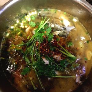 下鱼片,煮约一分钟关火,(久了鱼肉老了口感不好当然,取决于鱼肉的厚薄,如果鱼片很薄,下锅后默数数三下即可关火)倒入刚备好料的盘子里,然后放香菜,干辣椒粉,辣椒碎