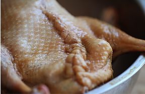 锅中入油 油热时 将油均匀的淋在鸭身上 呈金黄色后 将鸭子放在一旁