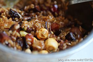 把其它所有馅料切丁与糯米拌匀,加盐、老抽、红葡萄酒、香油、调好咸味