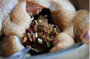 然后用消过毒的针线将鸭肚子缝和 防止煮时馅料跑出来
