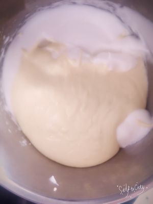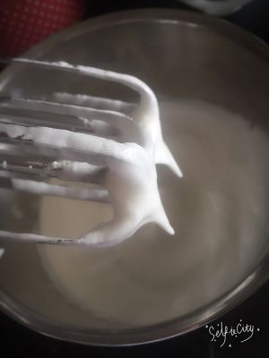 蛋白加入几滴柠檬汁打发到9成,剩下的白糖分两次加入进去,最后有一点点弯曲的样子就是9成发了