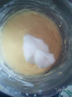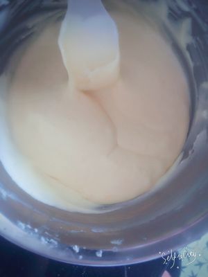 在加入黄油融化,在分三次加入三个鸡蛋黄,最后加入25克面粉搅拌均匀,待用