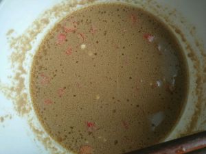 现在碗里放入麻汁用温水调开。再放入盐,辣椒,生抽,醋,蒜,香油。调均匀