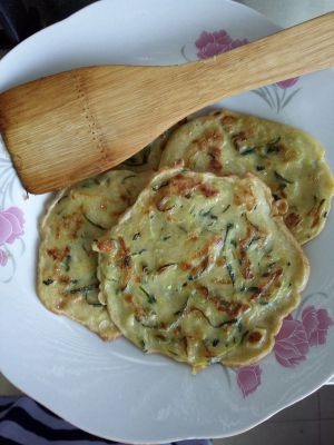 1.茭瓜切成丝放盐出水后,挤出水。2.调成面糊状将瓜丝放入其中,放2枚鸡蛋。3.加入五香粉和葱花。