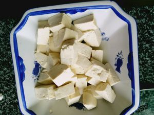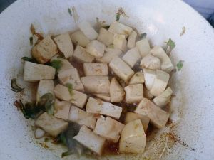 放入豆腐,放入盐和鸡精,翻炒均匀,大约2分钟豆腐表皮略焦即可