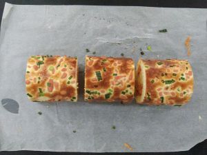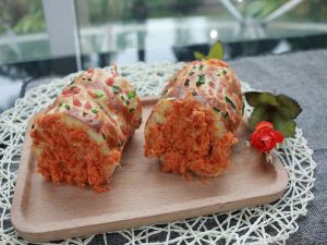 卷起,将两个端切平,再说切成3分,在两端涂上沙拉酱粘上肉松。